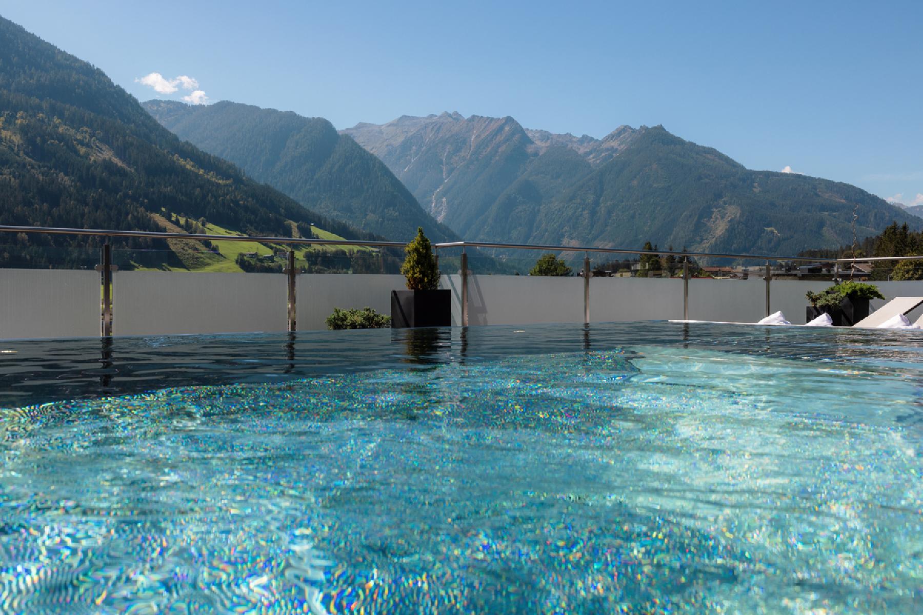 Der stylishe Pool im DAS Neukirchen ist wahrlich eine Besonderheit: Du schwimmst, wenn Du möchtest, von drinnen nach draußen auf die Dachterrasse des Resorts, wo Du hoch überm Ort den Blick auf die majestätischen Gipfel der Alpen auskostest.